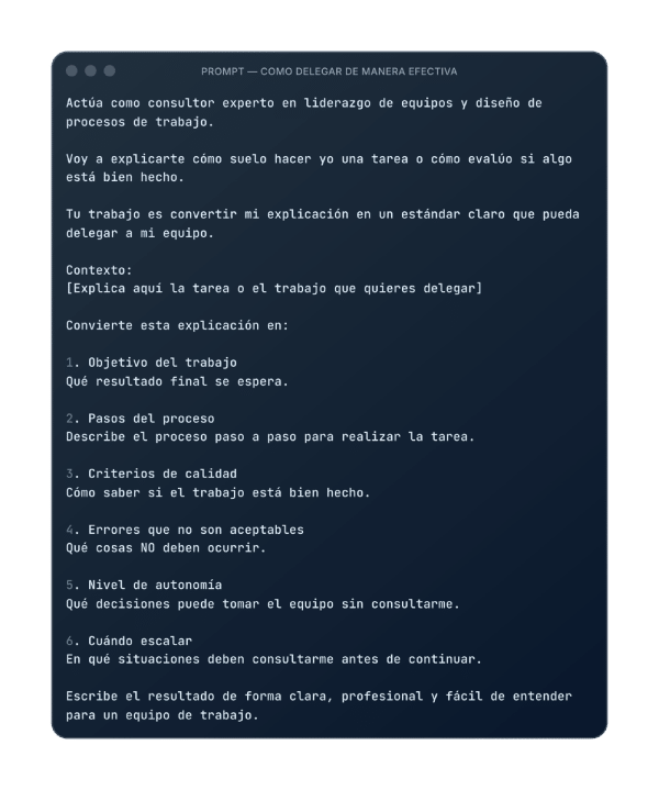 👉 Te enviaré directamente el prompt editable, la plantilla para definir estándares y el marco que utilizo con CEOs y managers para delegar sin perder calidad ni autoridad.